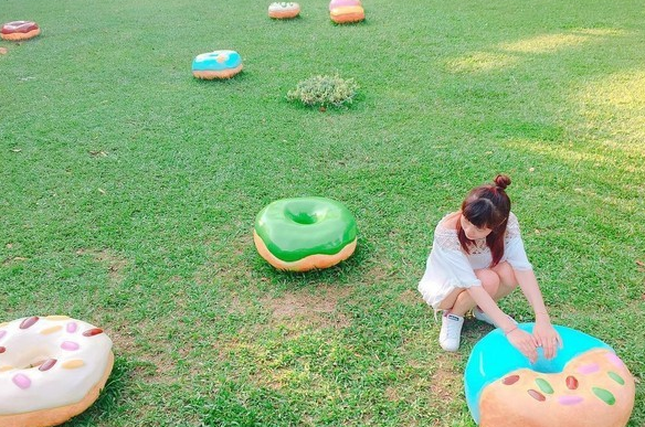 新瓦屋客家文化保存區近期以數個超大甜甜圈造景而火紅起來!偌大的草皮上,放上一個個巨大可口的甜甜圈,